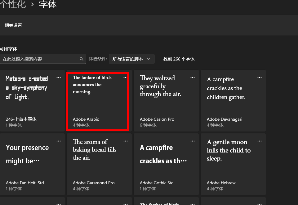 在“字体”设置页面中,浏览所有已安装的字体。点击你想要的字体,记下字体的确切名称(如“Arial”或“Microsoft YaHei”)。