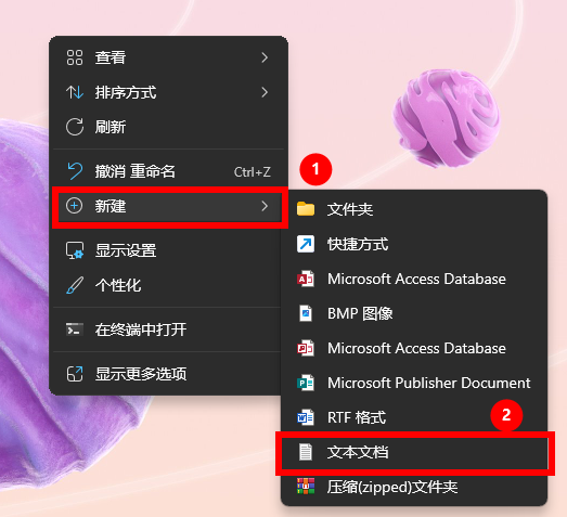 右键点击桌面空白处,选择新建 -> 文本文档。
