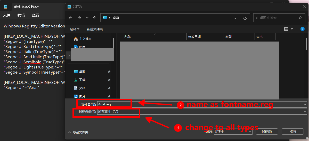 在文件名框中输入更改字体.reg,将保存类型选择为所有文件,然后点击保存。