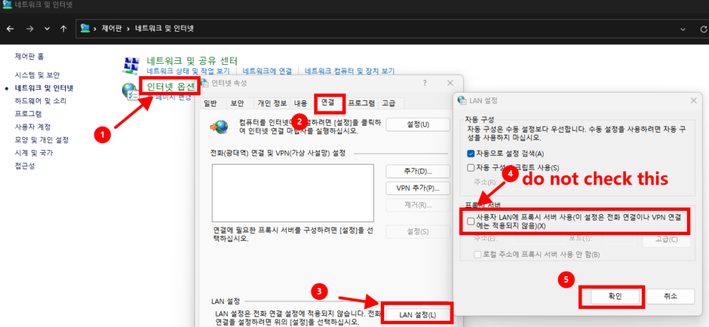 打开“控制面板” >> 打开“网络和Internet” >> 打开“Internet options” >> 点击“连接”选项 >> 点击“LAN设定” >> 不勾选“使用代理服务器为您的局域网”
