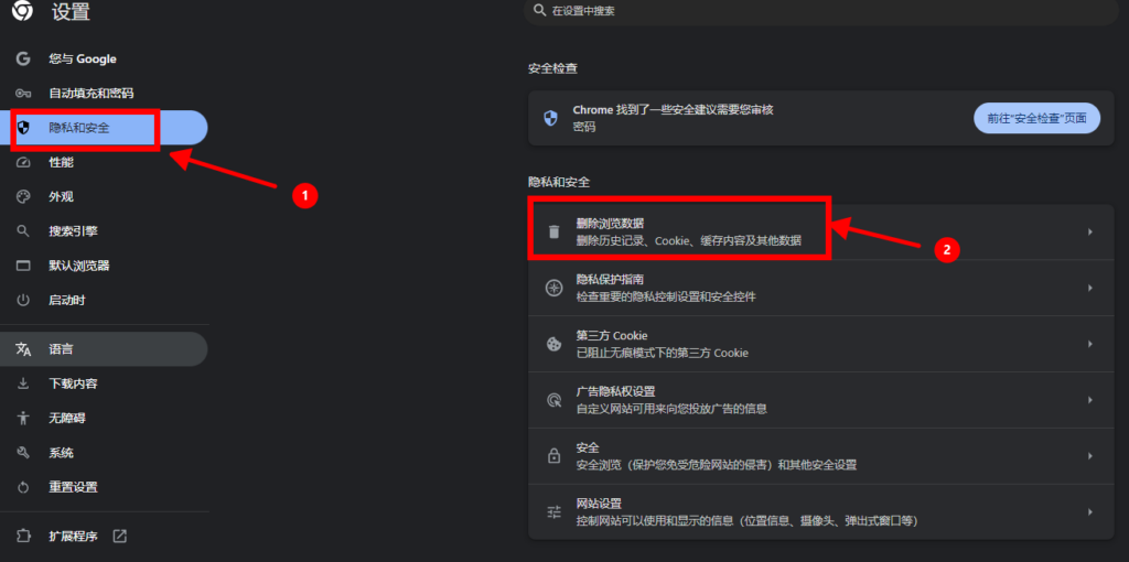 在设置的窗口中,点击“隐私和安全” >> 点击“删除浏览数据”