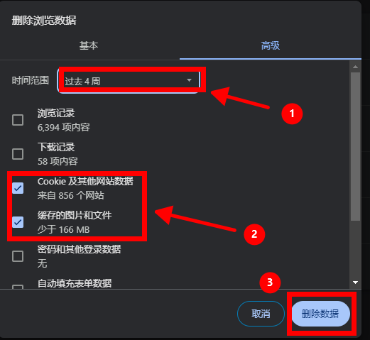 选择“时间范围”为“过去4周” >> 勾选“Cookie及其他网站数据”和“缓存的图片和文件” >> 点击“删除数据”