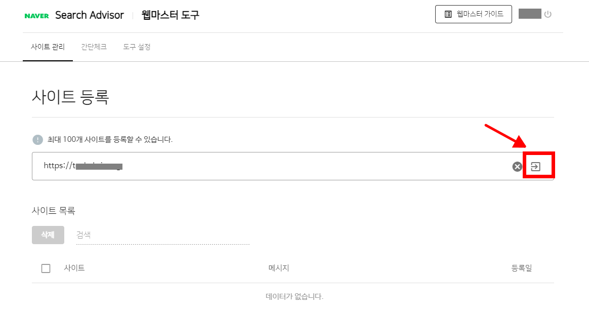서치 어드바이저 메인 화면에서 “사이트 등록“을 클릭한 후, 사이트 URL을 입력합니다.