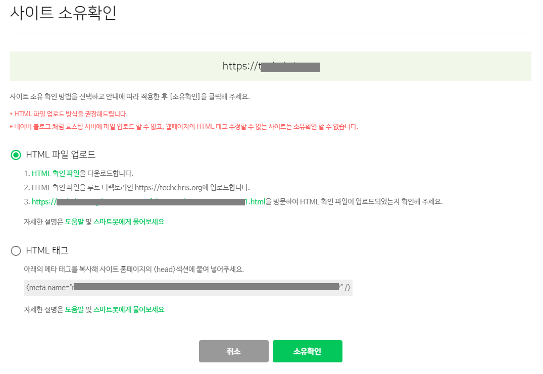 네이버는 사이트 소유권을 확인하기 위해 HTML 파일 업로드, HTML 태그 삽입, DNS 기록 추가 중 하나를 요구합니다.