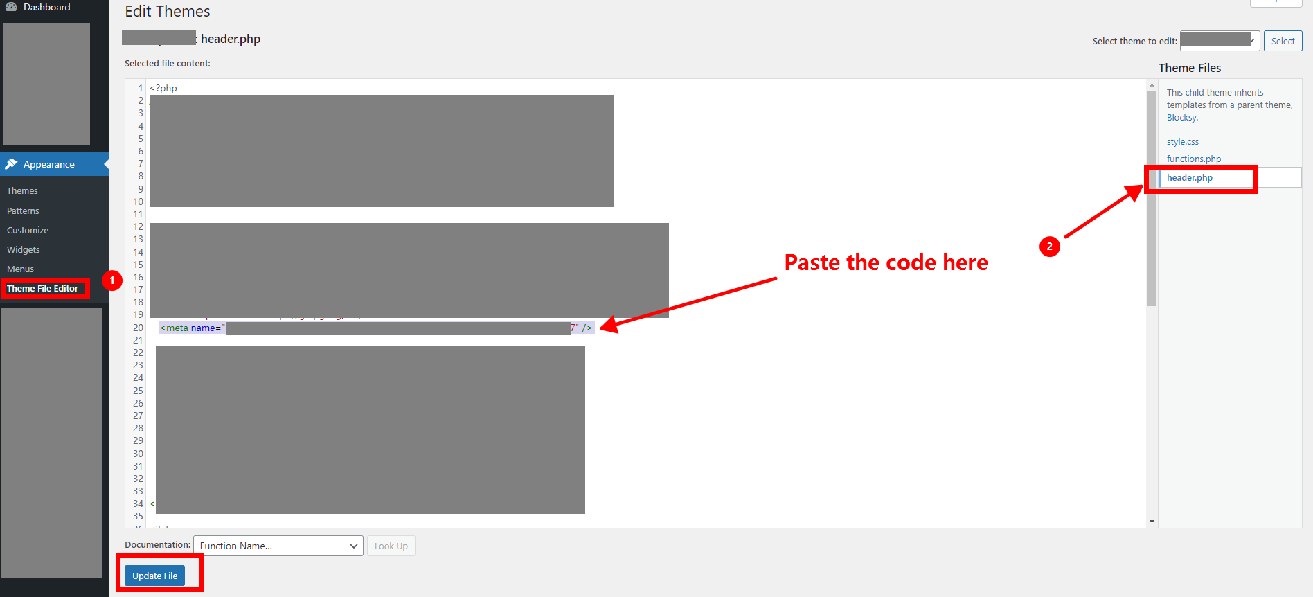 워드프레스의 “대시보드” >> “테마 파일 편집기“로 이동 >> header.php 파일을 선택 >> 아까 복사된 HTML 태그 바로 <head> </head> 사이에 붙여넣으면 됩니다.