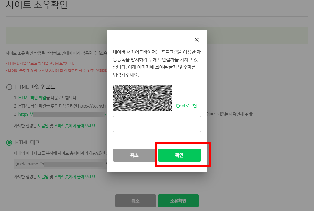 메타 태그를 삽입한 후, 서치 어드바이저에서 “확인” 버튼을 클릭합니다.