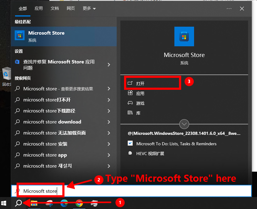 하단의 검색창에 “Microsoft Store” 를 입력하여 마이크로소프트 스토어를 엽니다.