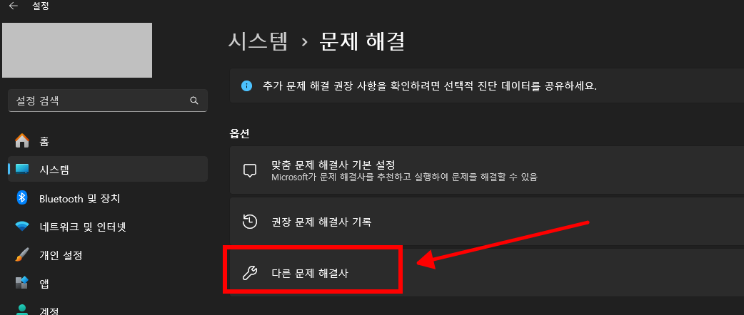 [Windows + I ]키를 눌러 설정을 열고, 시스템 -> 문제 해결 -> 다른 문제 해결사로 이동합니다.