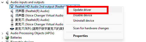 오디오 장치를 오른쪽 클릭하고 드라이버 업데이트를 선택합니다.