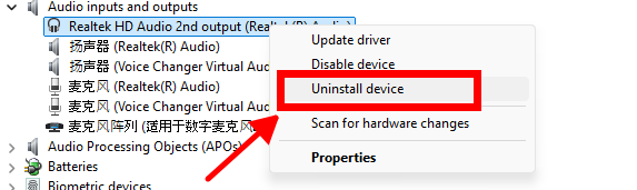 장치 관리자에서 오디오 장치를 오른쪽 클릭하고 장치 제거를 선택하여 드라이버를 삭제합니다.