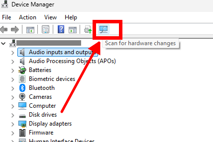 제거가 완료되면 작업 탭에서 하드웨어 변경 사항 검색을 클릭하여 Windows에서 자동으로 드라이버를 다시 설치하도록 합니다.