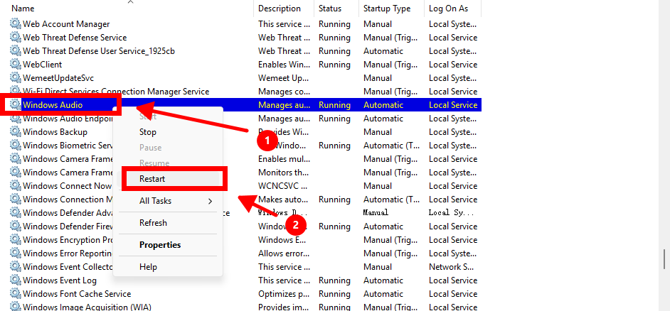 서비스 목록에서 Windows Audio 서비스를 찾고 오른쪽 클릭하여 다시 시작을 선택합니다.