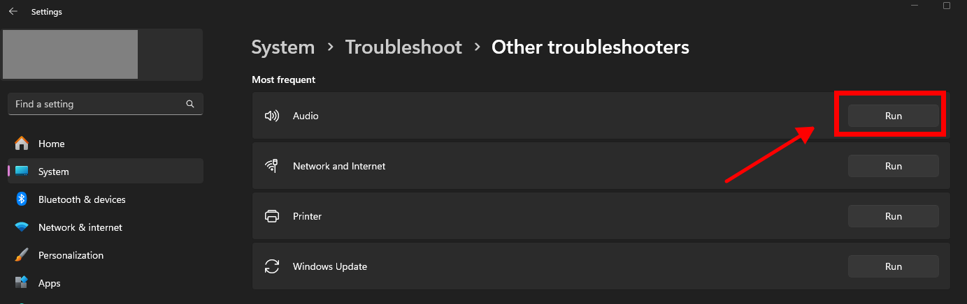 오디오 재생 섹션에서 실행 버튼을 클릭하여 문제 해결사를 실행합니다.