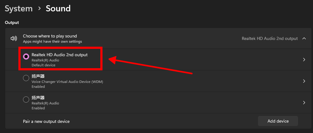 출력 섹션에서 사용하려는 오디오 장치를 선택하여 기본 장치로 설정합니다.