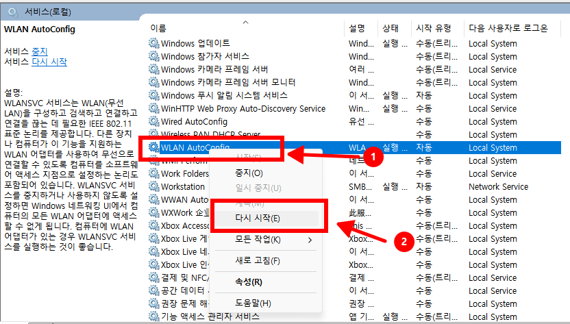 WLAN AutoConfig 서비스를 찾고, 해당 항목을 오른쪽 클릭하여 다시 시작을 선택합니다.