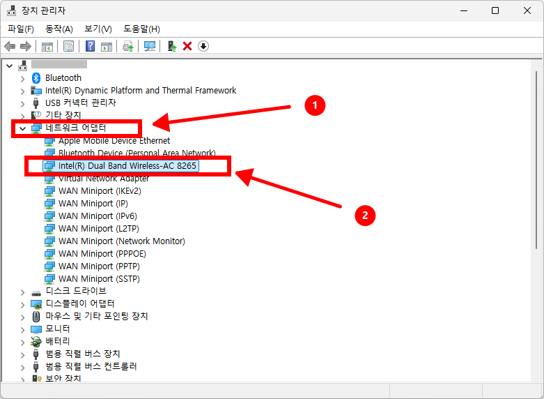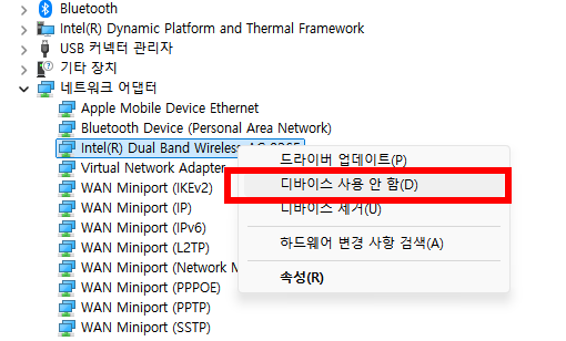 네트워크 어댑터를 확장하고, 사용 중인 Wi-Fi 어댑터를 찾고 나서 해당 어댑터를 오른쪽 클릭하여 장치 비활성화를 선택합니다.