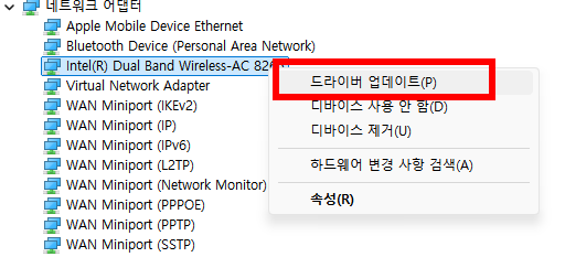 네트워크 어댑터에서 사용 중인 Wi-Fi 어댑터를 오른쪽 클릭하고, 드라이버 업데이트를 선택합니다.