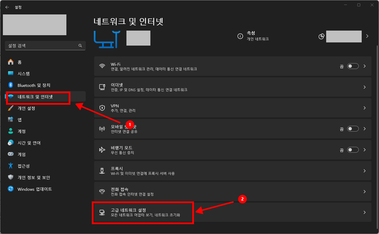 [Windows + I] 키를 눌러 설정을 엽니다. 네트워크 및 인터넷 메뉴에서 고급 네트워크 설정을 선택합니다.