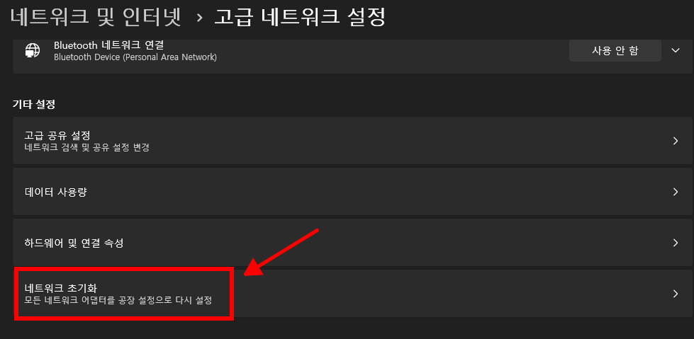 하단의 네트워크 초기화를 클릭하고 지금 다시 설정을 선택합니다.