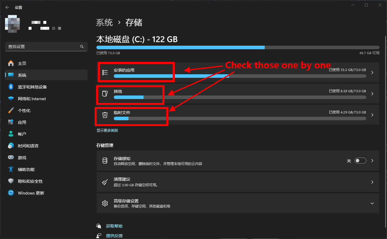 설정 열기: [WIN + I] → “시스템” → “저장소” 클릭