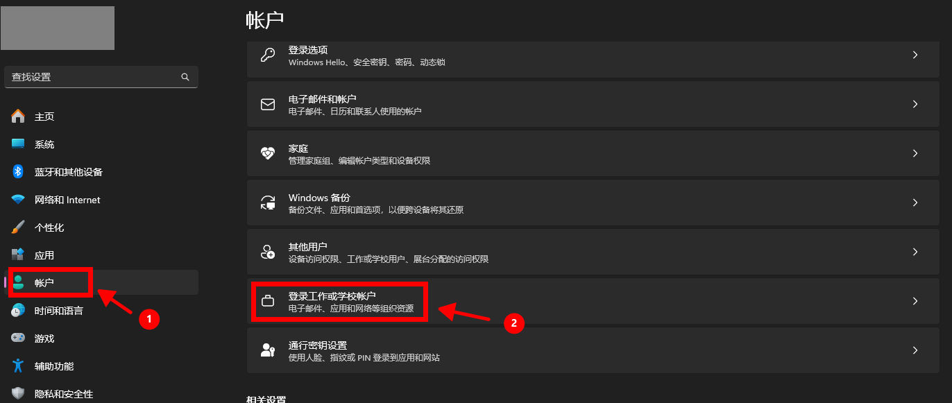 按快捷键【win+i】打开“设置” >> 点击“帐户” >> 点击“登录工作或学校账户”