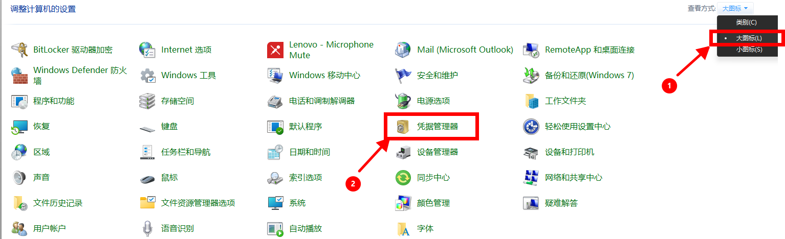 打开“控制面板” >> 打开右上角的“大图标” >> 打开“凭据管理器”