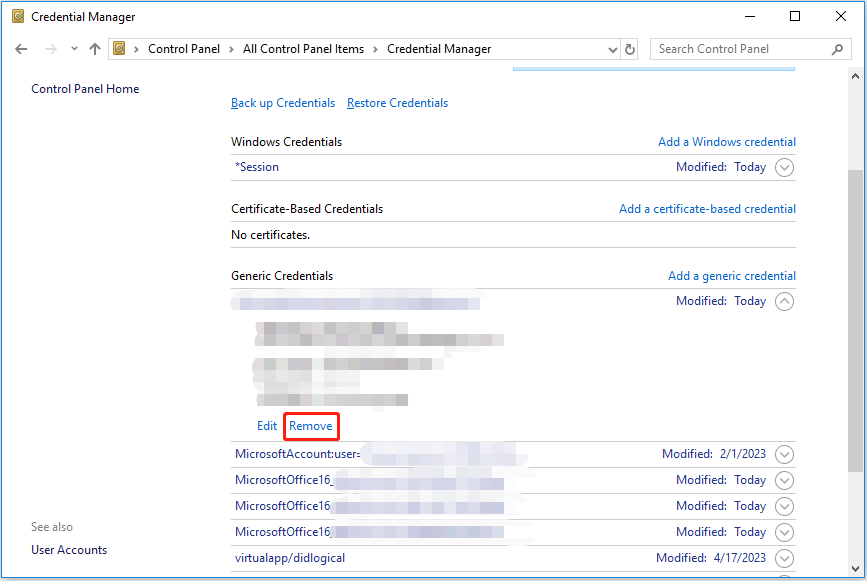 转到“Windows凭据” >> 检查是否有无法登录的OneDrive,Outlook或其他Microsoft程序的凭据。