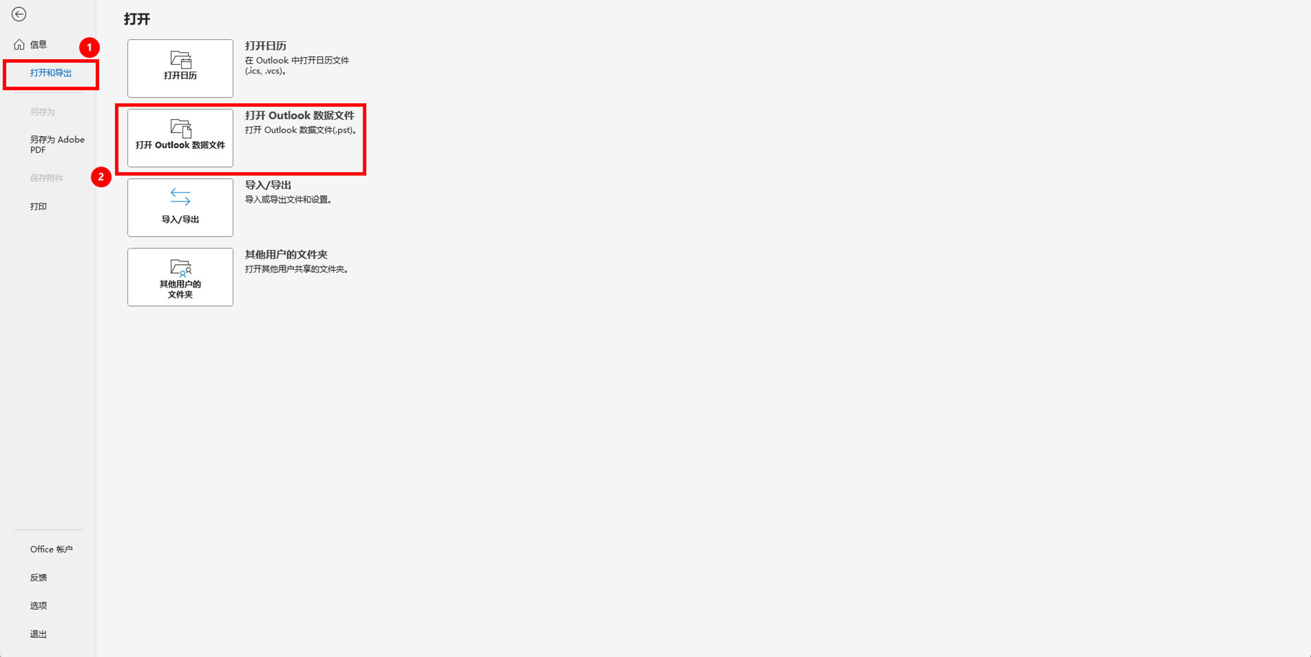 2. 点击功能区顶部的”文件”选项。然后选择”打开和导出”>”导入/导出”。(若“导入/导出”按钮是灰色,请参考”导入/导出“按钮显示灰色的问题”)