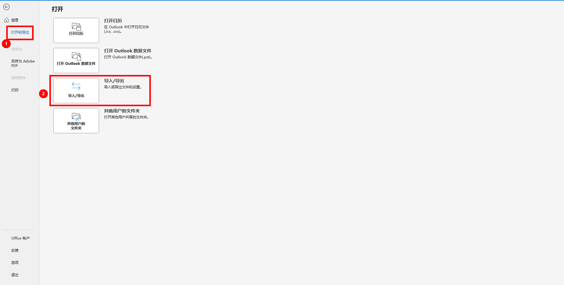1. 打开Outlook,点击”文件”菜单,选择”打开和导出”选项。