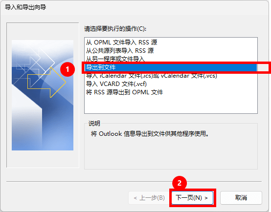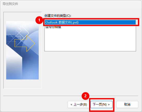 3. 在”导出到文件”中选择”Outlook数据文件(.pst)”,点击”下一步”。