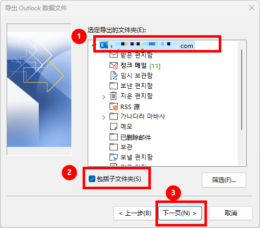 4. 在”导出Outlook数据文件”中,选择要导出的邮箱账号或者文件夹,如果要导出所有数据,可以选择”顶级文件夹”,并勾选”包括子文件夹”。点击”下一步”。