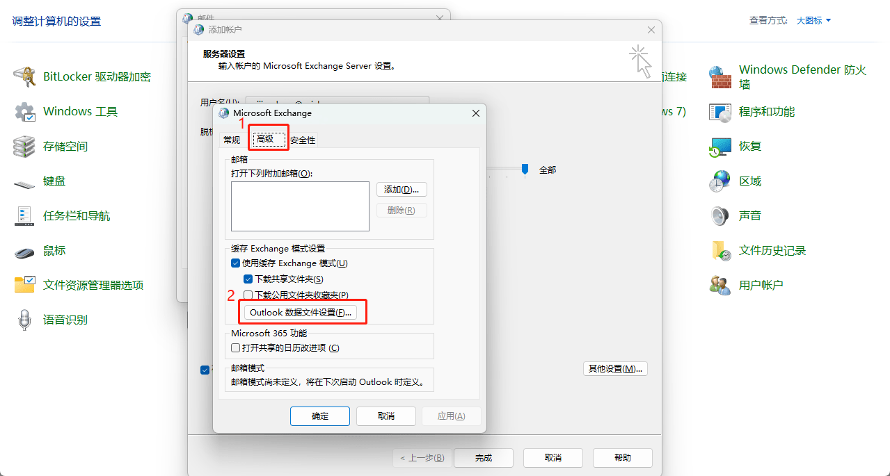 - 点击上边的“高级” >>点击“Outlook数据文件设置”