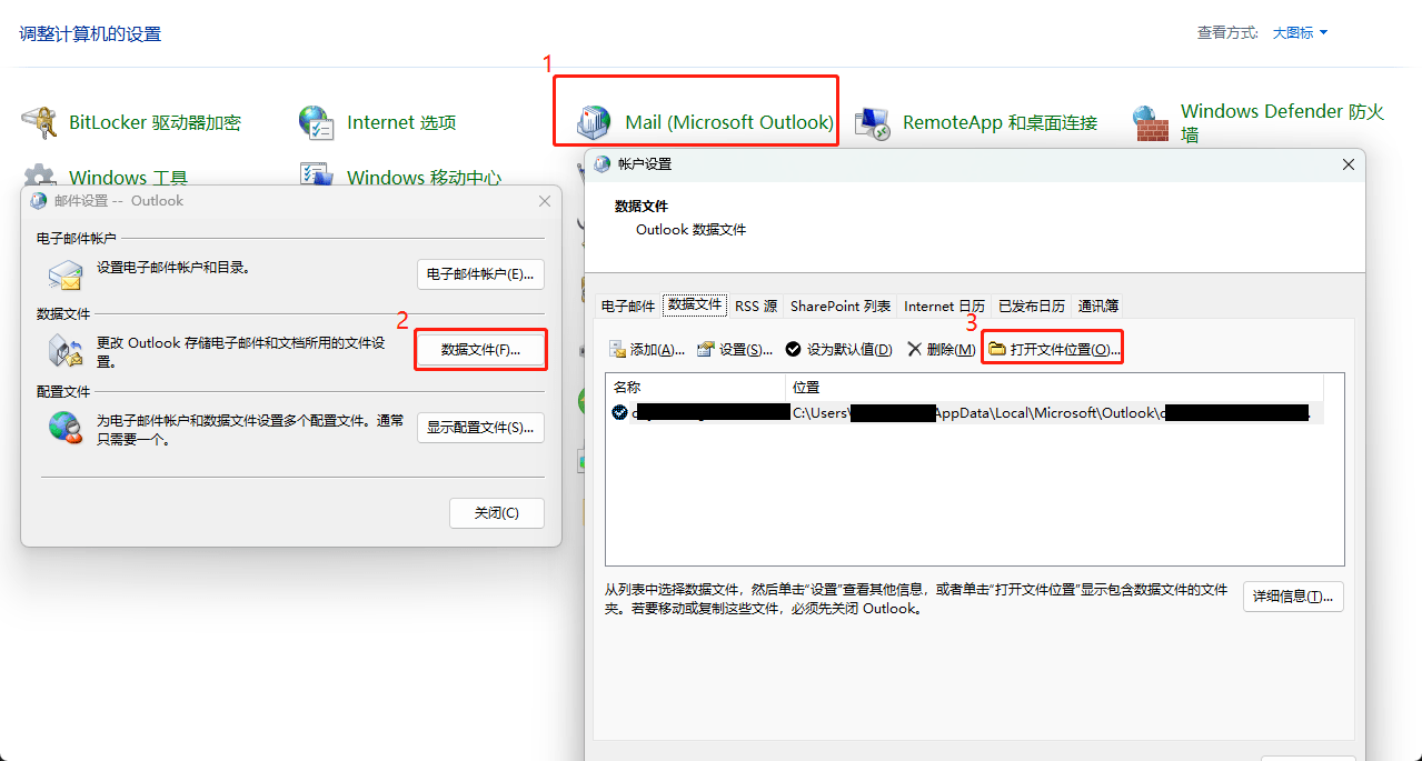 - 打开“控制面板”>> “Mail”>>“打开文件夹位置”
