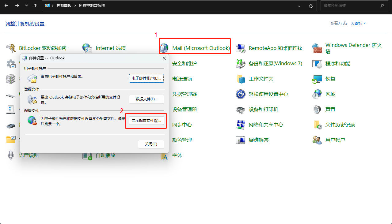 - 打开“控制面板”>> “Mail” >>“显示配置文件”