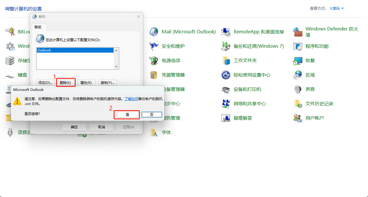 - 删除“Outlook配置文件” >> 点击“确定”