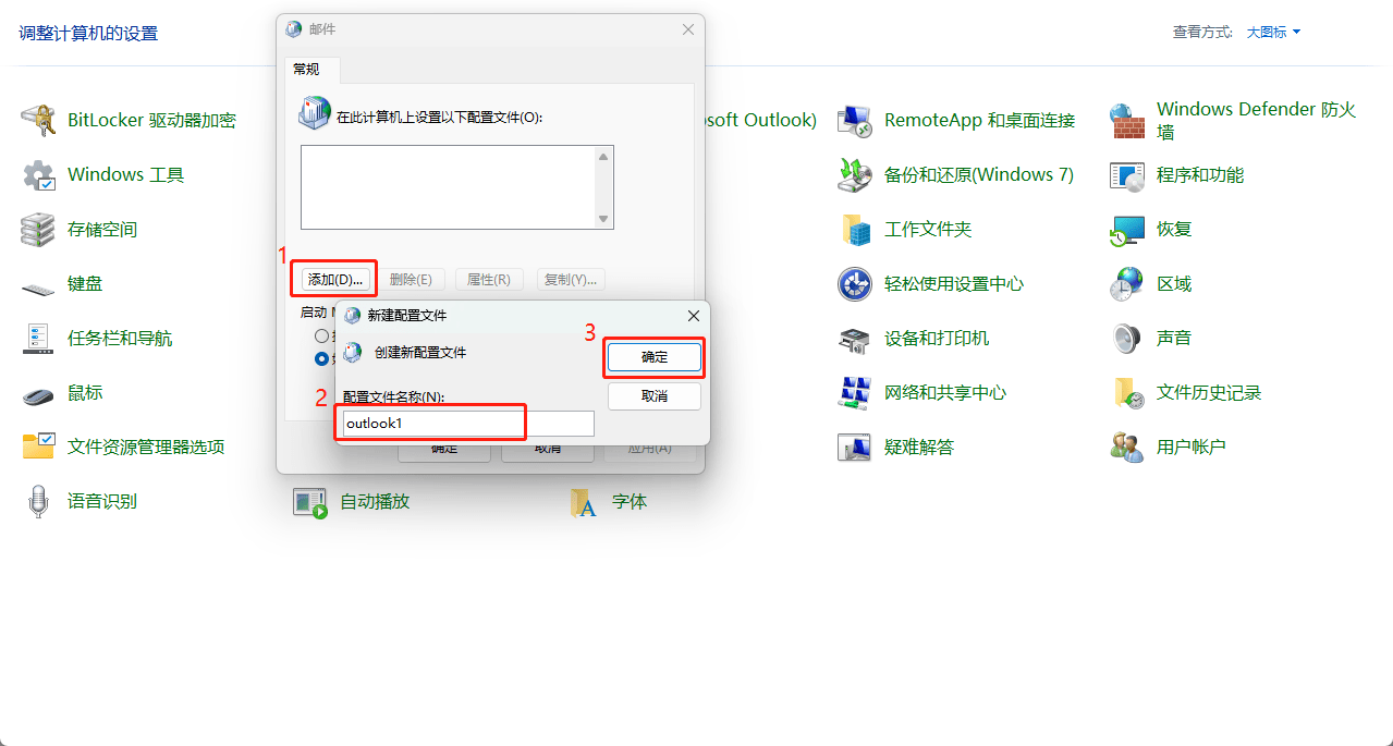 - 点击“添加”>>命名为“outlook1” >>点击“确定”