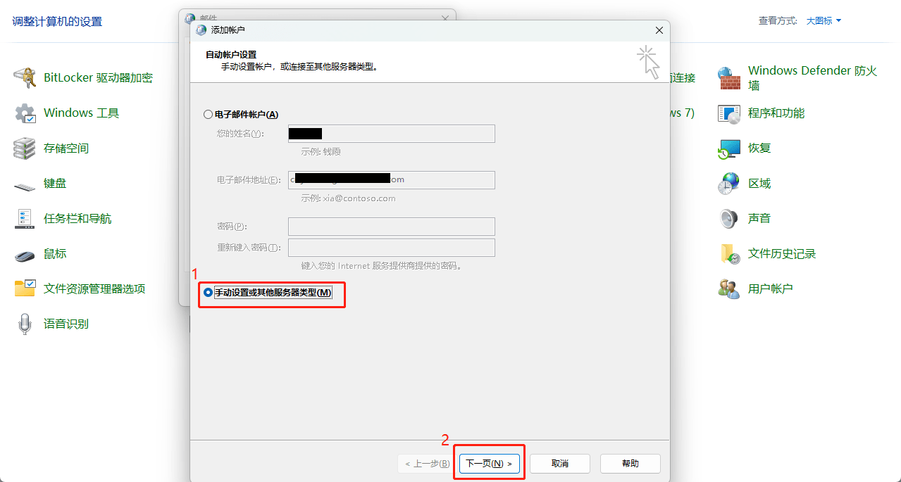 - 选择“手动设置或其他服务器类型” >>点击“下一步”
