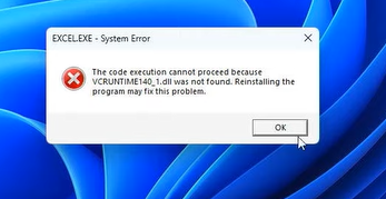 Windows11电脑打开excel出现了VCRUNTIME140_1.dll丢失的错误,Visual C++ Redistributable是微软(运行库)的一部分,这个错误提示表示系统无法找到 VCRUNTIME140_1.dll 文件。