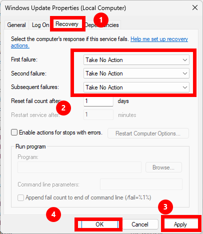 再点击恢复 -> 将第一次失败,第二次失败和后续失败的选项换成无操作 -> 点击应用 -> 确定。
