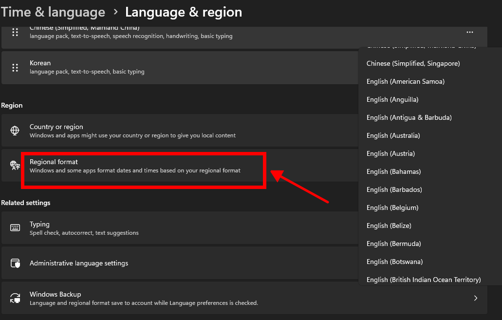 - 点击 管理语言设置,选择 更改系统区域设置。