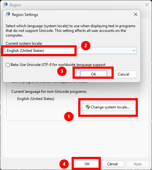 - 勾选 为非Unicode程序使用UTF-8(Beta) 或选择适当语言。