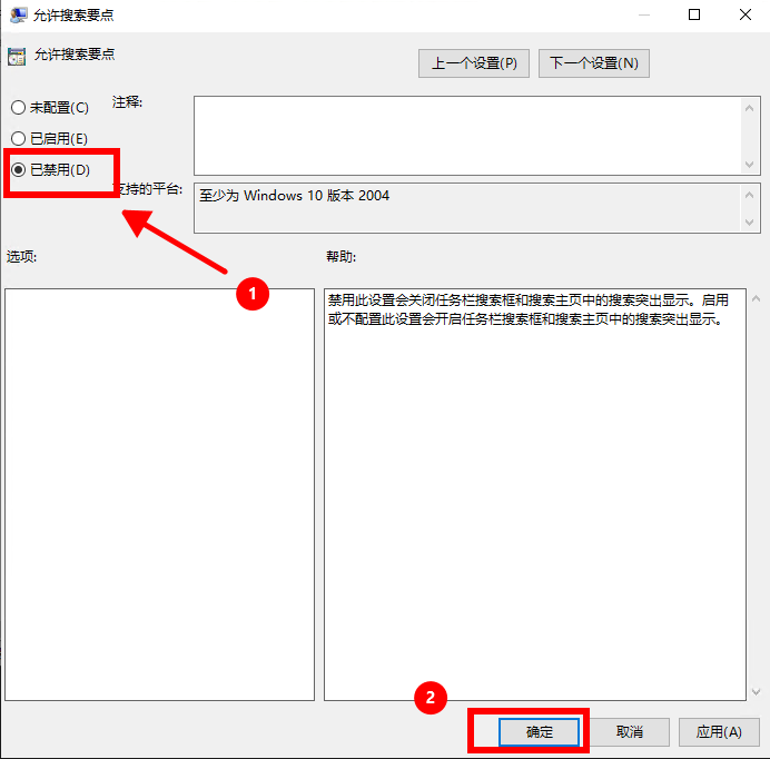 在右侧,找到允许搜索要点。双击该选项,将其设置为已禁用,然后点击确定。
