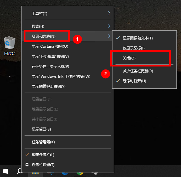 再次右键点击搜索栏 >> 点击资讯和兴趣 >> 点击关闭