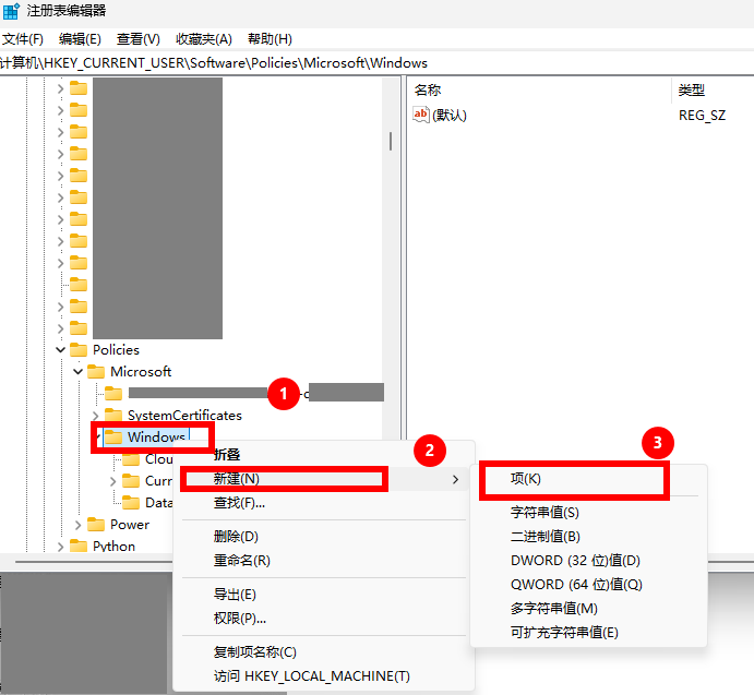 如果路径中没有Explorer文件夹,可以右键点击Windows文件夹,选择新建 -> 项,命名为Explorer。