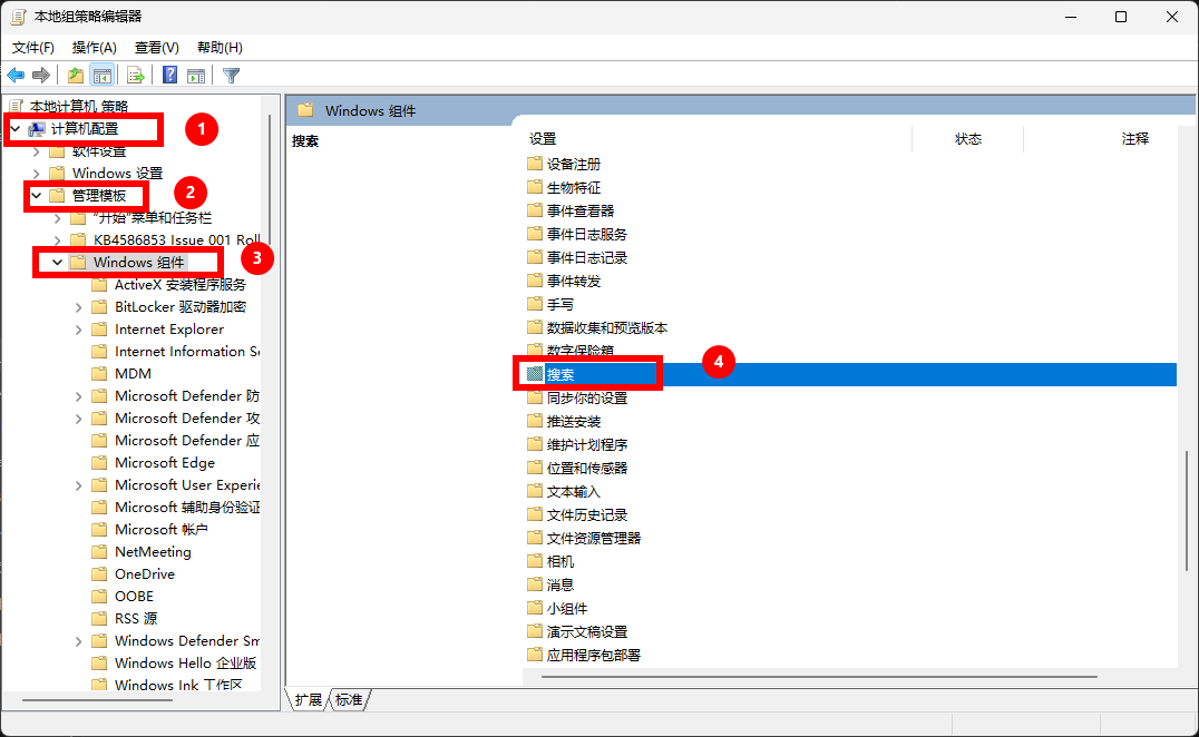 在组策略编辑器中,找到进入 计算机配置 > 管理模板 > Windows 组件 > 搜索
