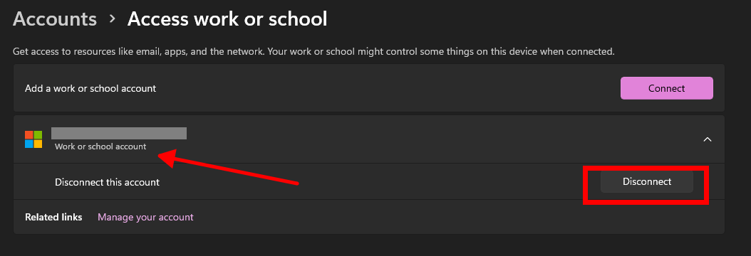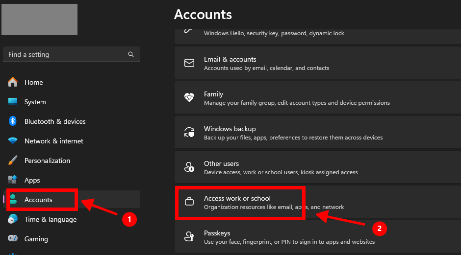 - 转到 账户 -> 工作或学校账户。