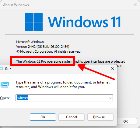 - 按 Windows + R,输入 winver,按回车。