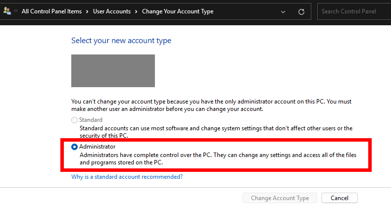 - 将账户类型更改为管理员权限,尝试再次登录。