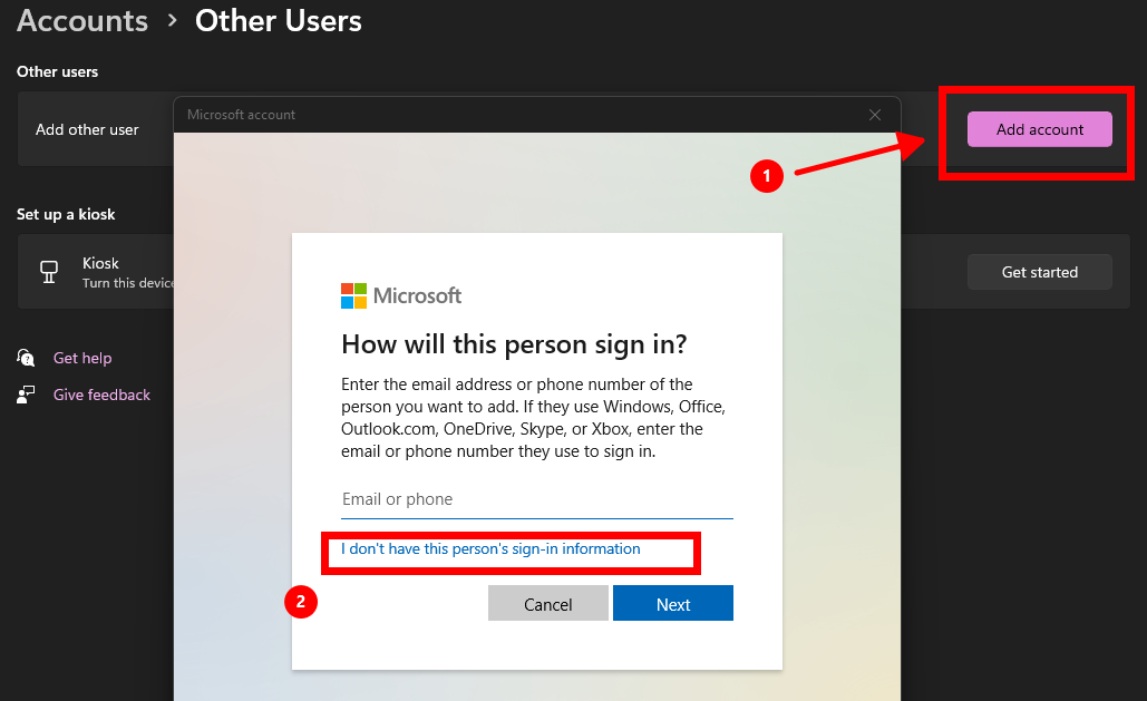 - 选择“没有此人的登录信息”,然后点击 添加没有Microsoft账户的用户。