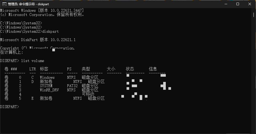 输入 list volume 来查看对应的卷标号